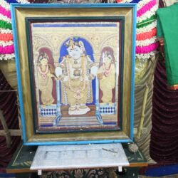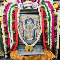 After Lord Vittal with His consorts moved to the Stage, His portrait was decorated artfully, a visual treat for bhaktas. Not only the Lord is decorated, His abode for the three days Vallalar Koil Mandapam is also decorated. The roof is the stage is decorated uniquely every year. Bhaktas sponsor the decorations with great joy and love towards Radhakrishna. The stage is covered with red carpet for bhagavathars to sit and mike sets are arranged for all to hear the proceedings with clarity. Air coolers have been placed strategically to keep the place cool and comfortable. Half of the street facing the stage, Vallalar Koil Double Street, is covered with pandal (a temporary erected of upright poles supporting a roof that is usually of bamboo matting; especially, a large open-sided temporary pavilion often used for large meetings) and chairs are placed for bhaktas to sit and watch the ceremonies and concerts. The arrangement of closed circuit TV since last couple of years has been a great value addition for the MRK which enables and close-up viewing for those sitting at the back too.